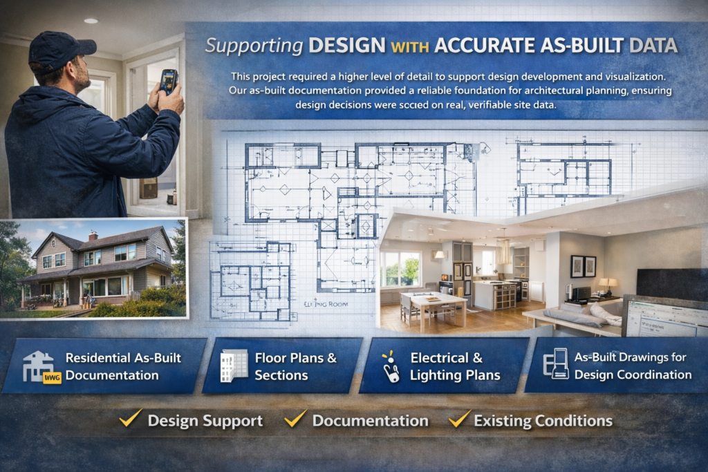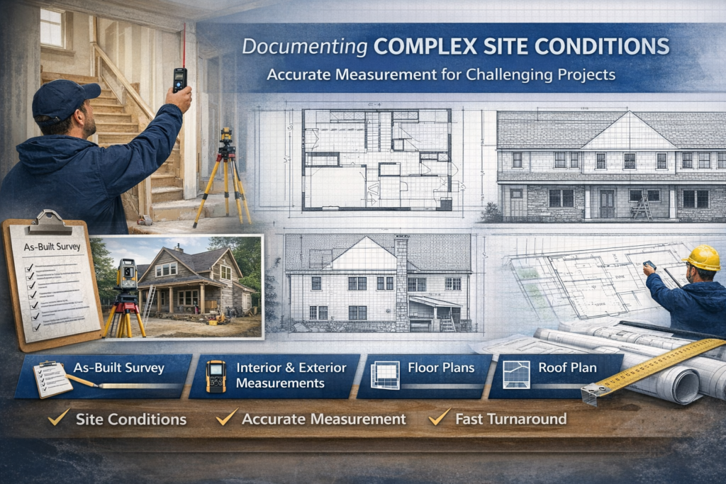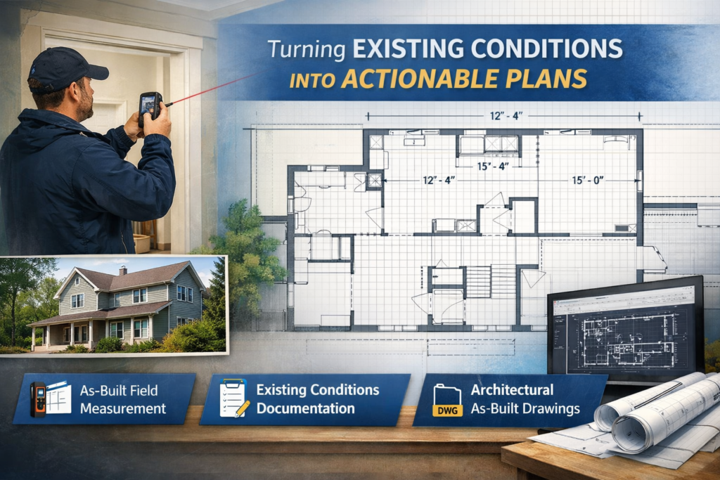 We capture existing conditions through on-site measurements and, when required, 3D scanning and digital measuring tools. All drawings are created from verified field data to ensure accuracy.